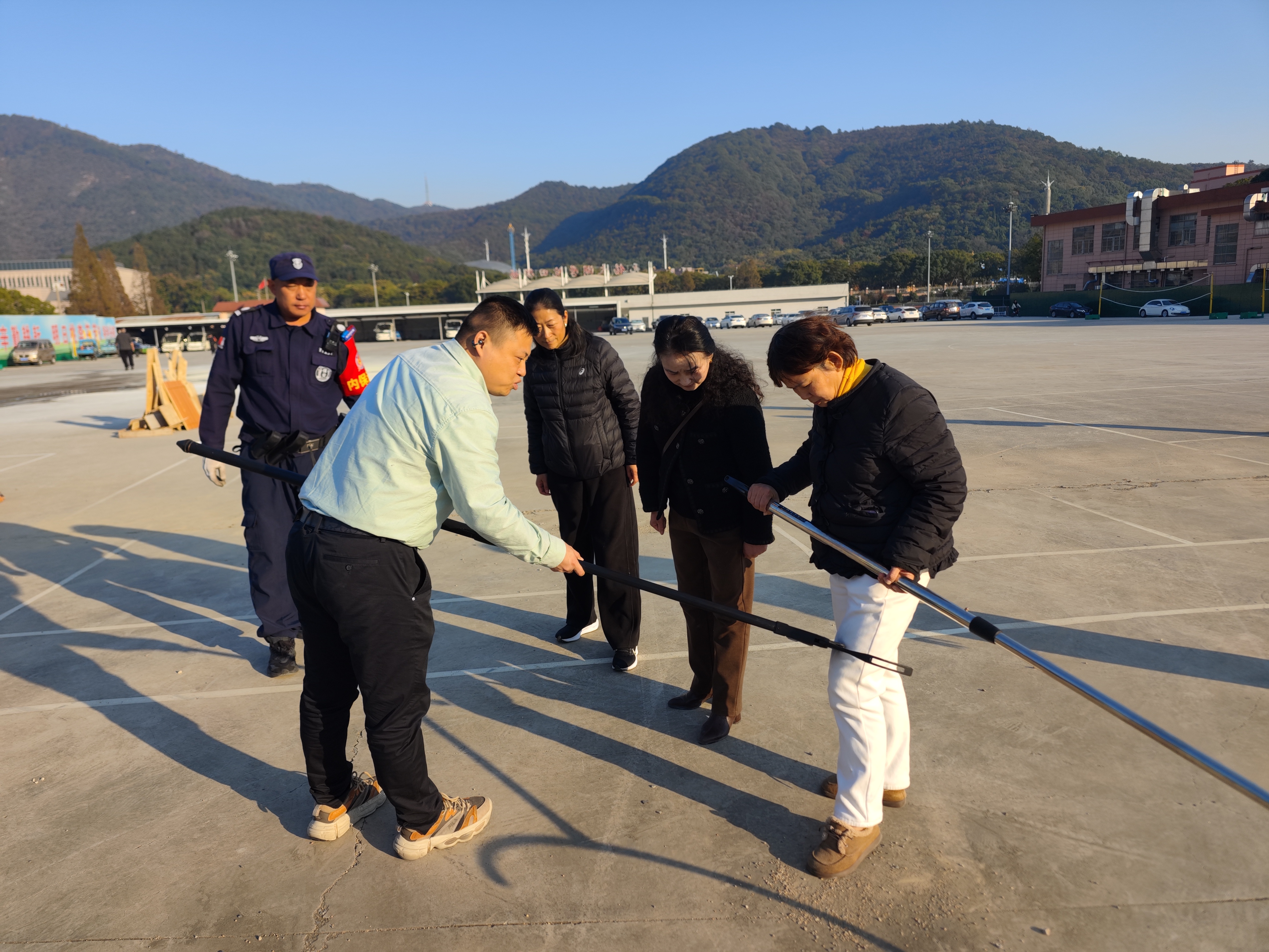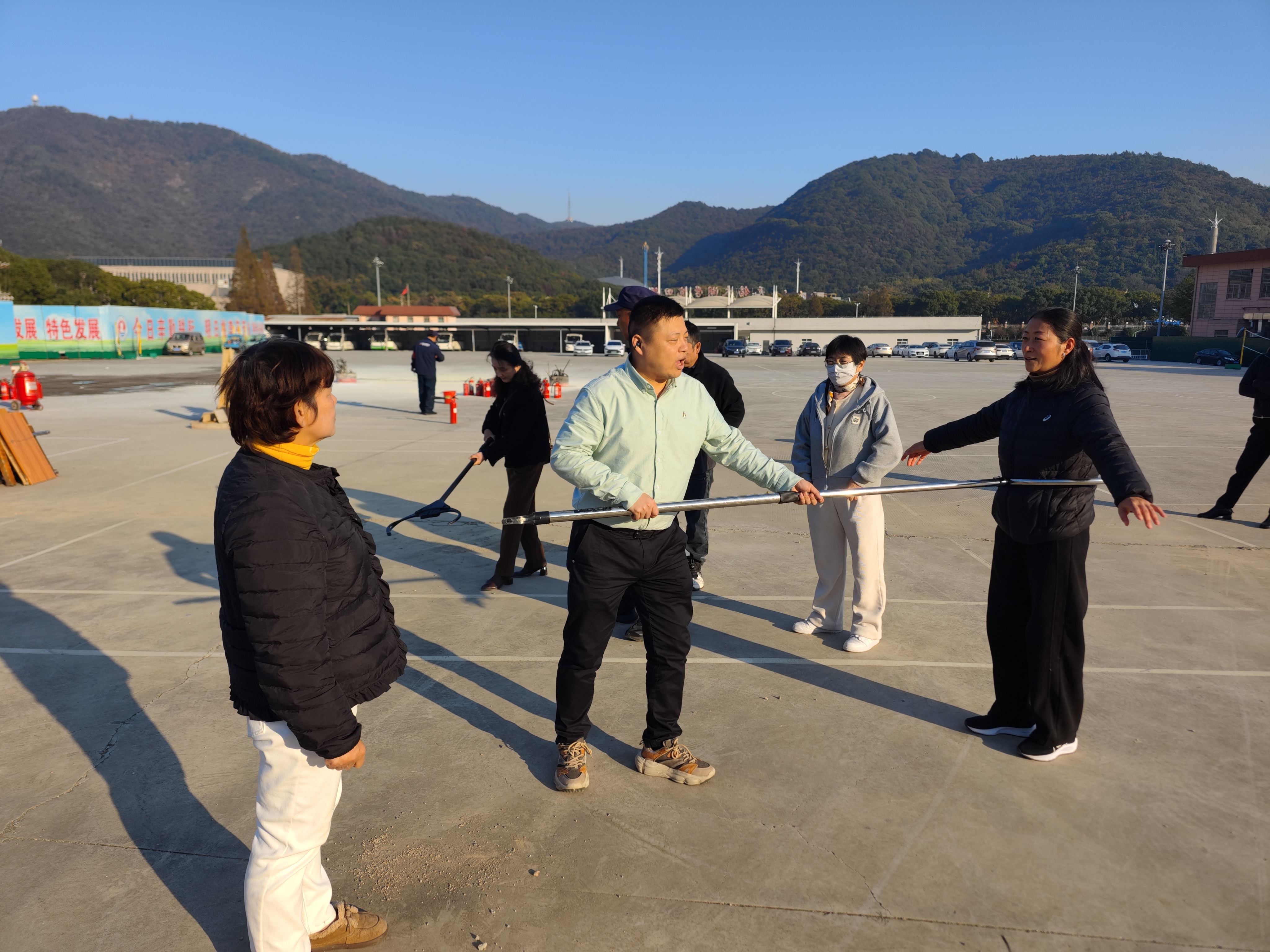 副处长王子乾为大家现场讲解了反恐防暴的处置流程,钢叉、盾牌、锁脚器等装备的使用方式方法,最小作战单元配合技巧等。现场指导宿管员、保安队员进行了最小作战单元实操演练。