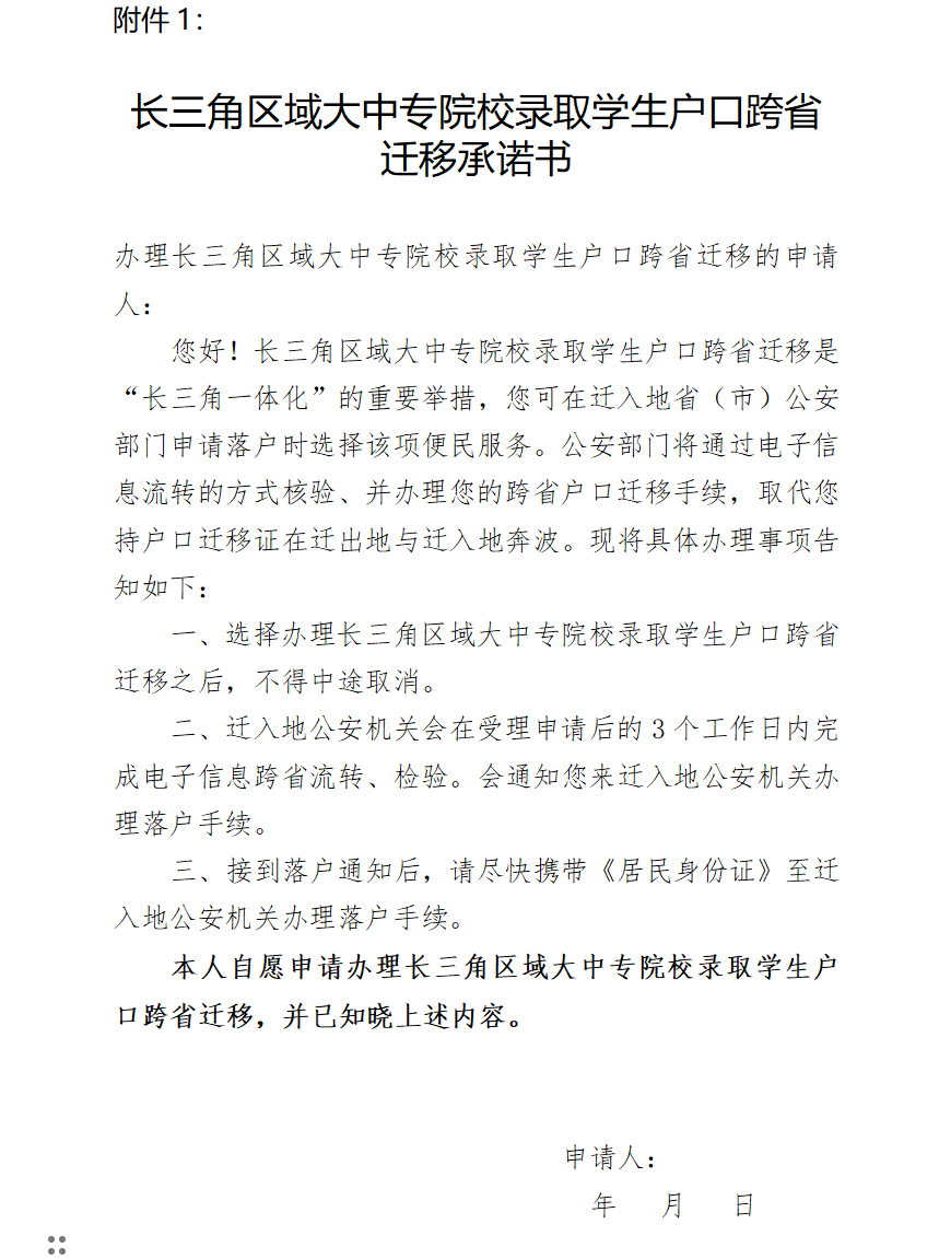 ③《长三角区域大中专院校录取学生户口跨省迁移承诺书》(见附件1)